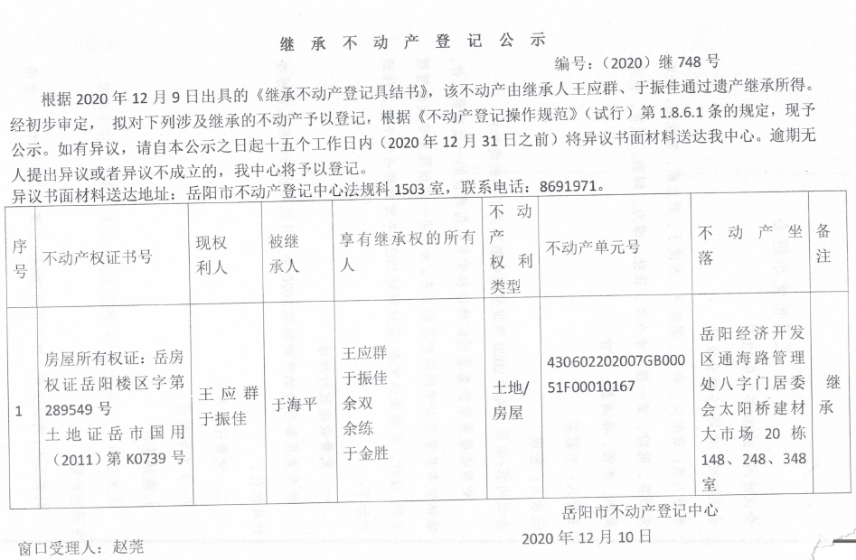 继承(受遗赠)不动产登记公告(王应群)