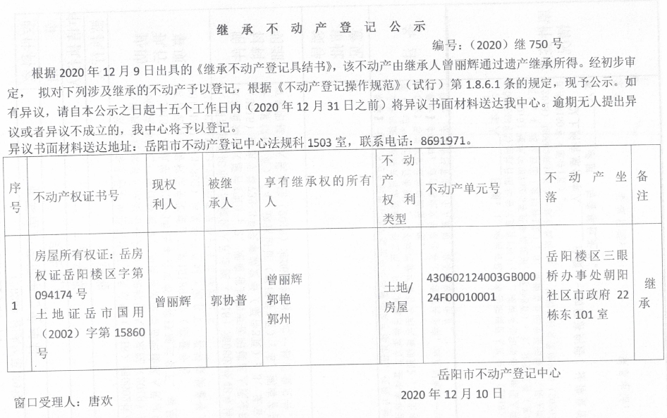 继承(受遗赠)不动产登记公告(曾丽辉)