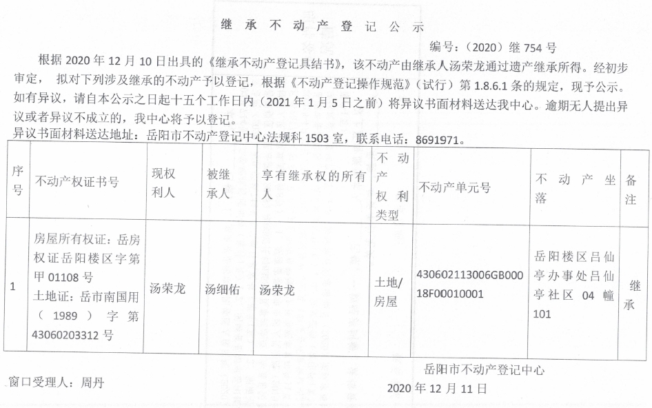 继承(受遗赠)不动产登记公告(汤荣先)