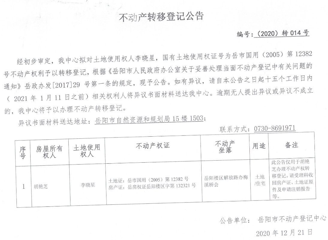 不动产转移登记公告 编号:(2020)转014号(李晓星)