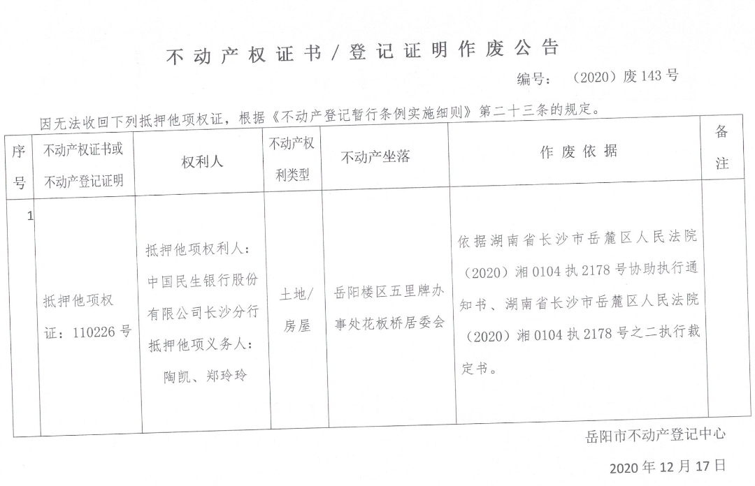 不动产权证书/登记证明作废公告 编号: (2020)废143号(抵押他项权利人中国民生银行股份有限公司长沙分行 )