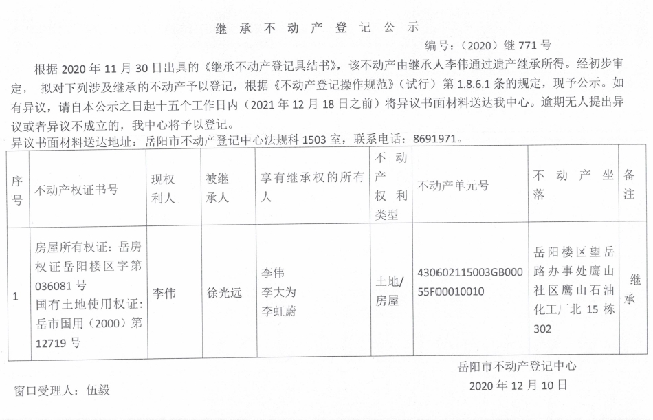 继承不动产登记公示 编号:(2020)继771号(李伟)