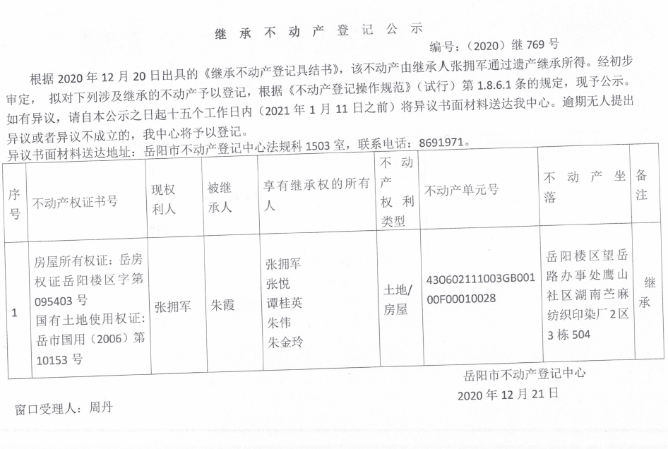 继承不动产登记公示 编号:(2020)继769号(张拥军)