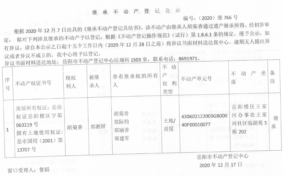 继承不动产登记公示 编号:(2020)继766号(胡菊香)