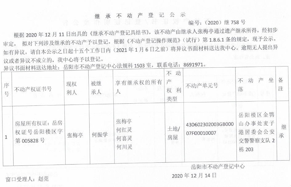 继承不动产登记公示 编号:(2020)继758号(张梅亭)