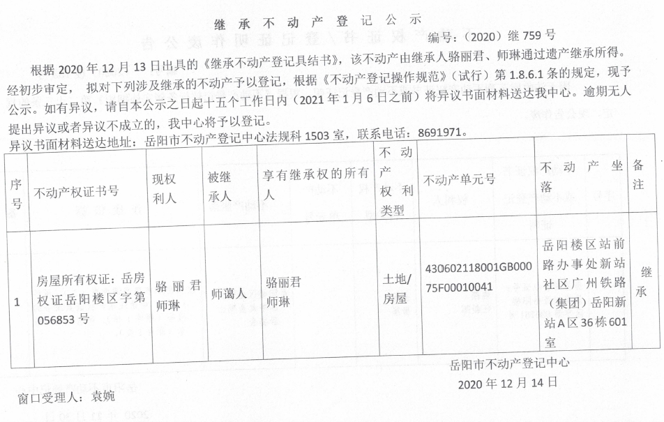 继承不动产登记公示 编号:(2020)继759号(师琳)