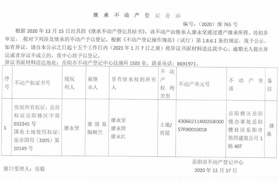 继承不动产登记公示 编号:(2020)继765号(廖永坚)