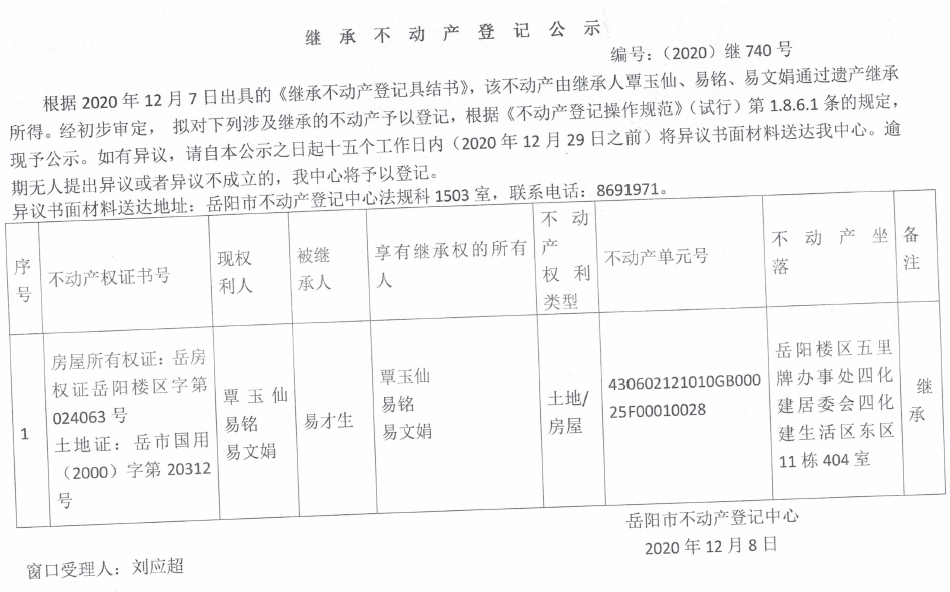 继承不动产登记公示 编号:(2020)继740号(易文娟)