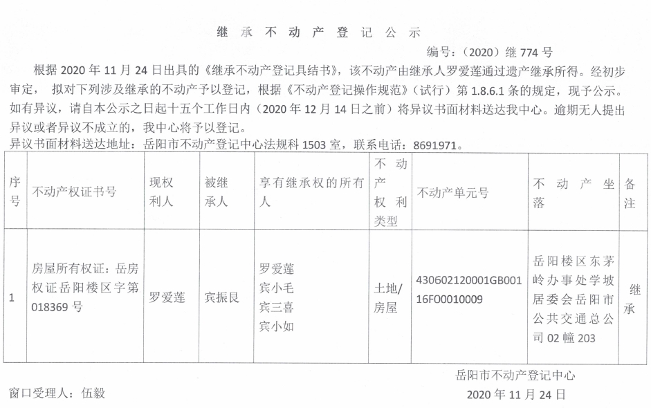 继承不动产登记公示 编号:(2020)继774号(罗爱莲)