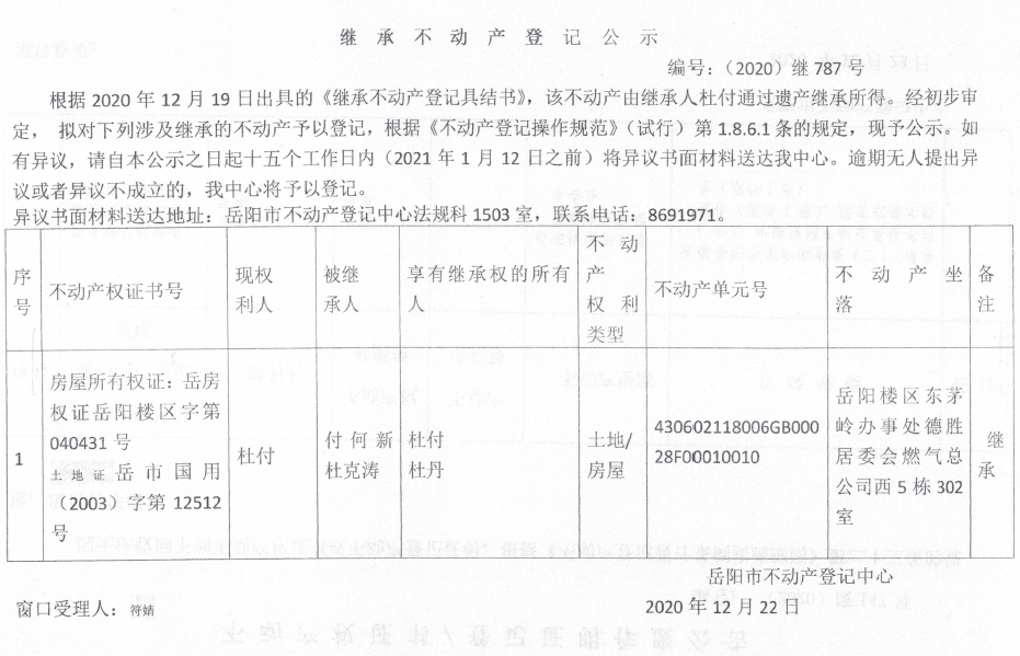 继承不动产登记公示 编号:(2020)继787号(杜付)