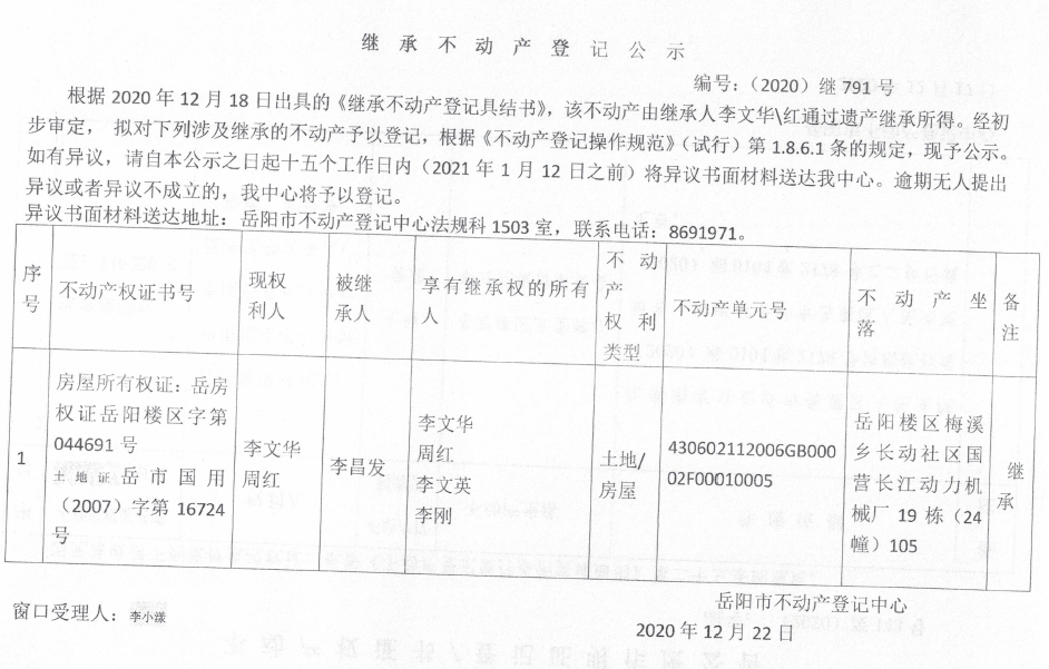 继承不动产登记公示 编号:(2020)继791号(周红)