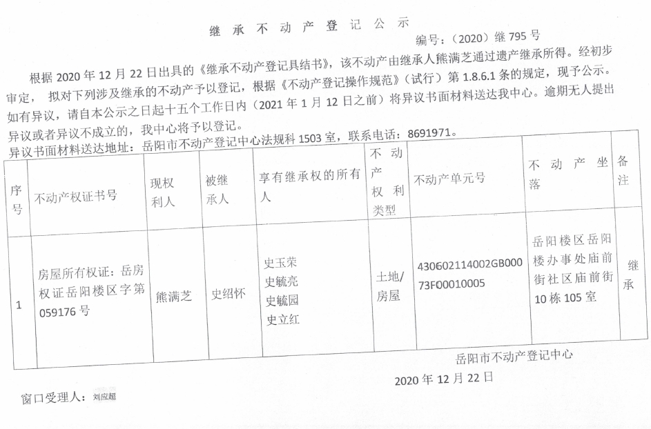 继承不动产登记公示 编号:(2020)继795号(熊满芝)