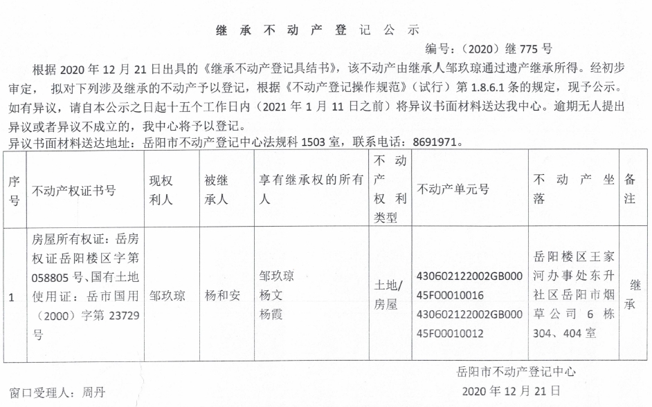 继承不动产登记公示 编号:(2020)继775号(邹玖琼)