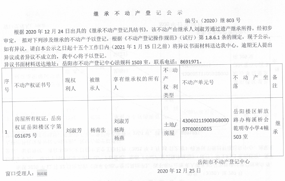 继承不动产登记公示 编号:(2020)继803号(刘淑芳)