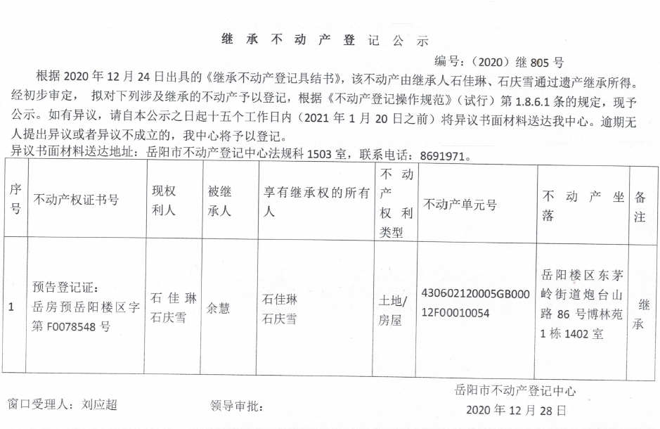 继承不动产登记公示 编号:(2020)继805号(石庆雪)