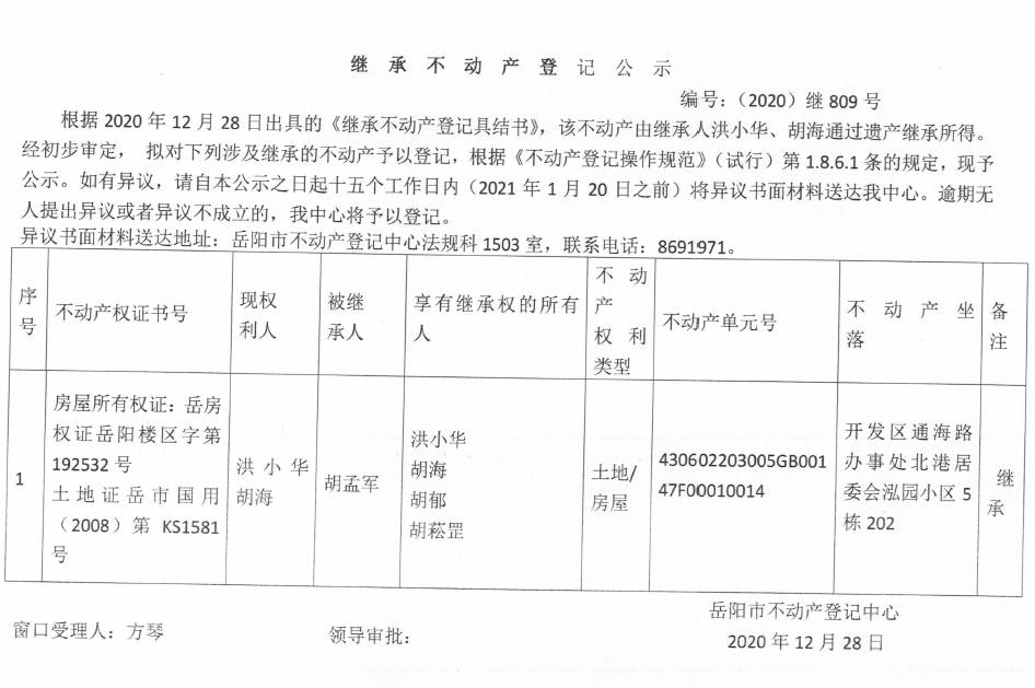 继承不动产登记公示 编号:(2020)继809号(胡海)