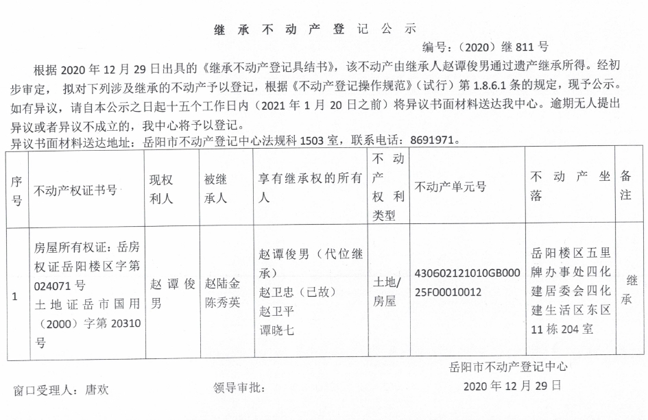 继承不动产登记公示 编号:(2020)继811号(赵谭俊男)