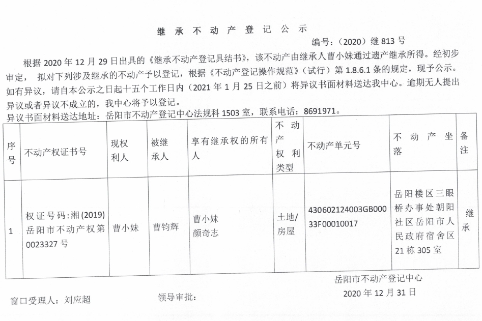 继承不动产登记公示 编号:(2020)继813号(曹小妹)