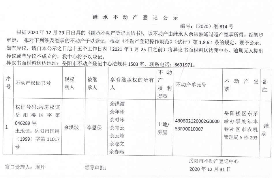 继承不动产登记公示 编号:(2020)继814号(余洪波)