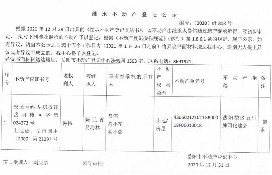 继承不动产登记公示 编号:(2020)继818号(易伟)