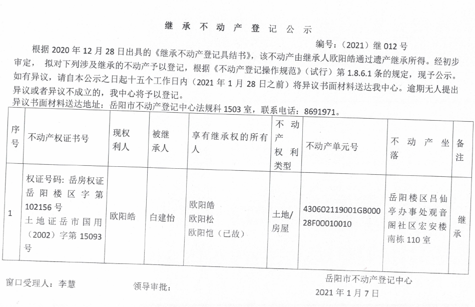 继承不动产登记公示 编号:(2020)继012号(欧阳皓)
