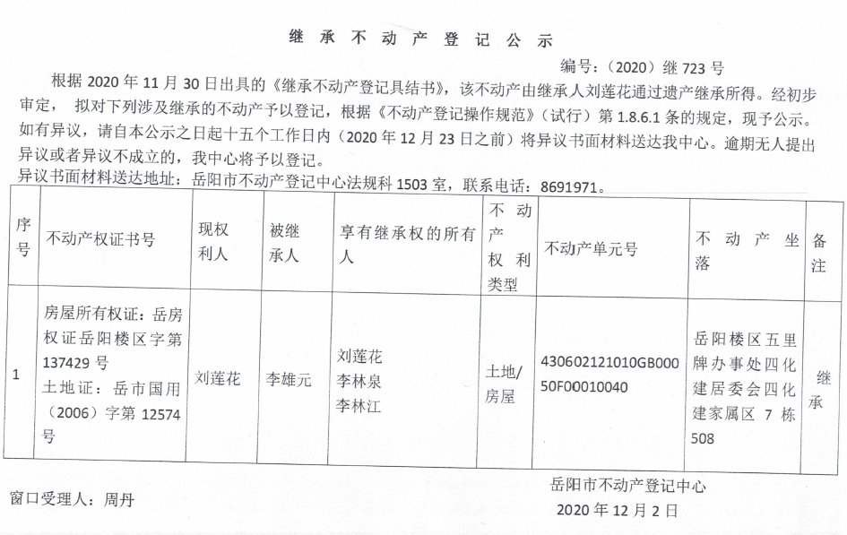 继承不动产登记公示 编号:(2020)继723号(刘莲花)