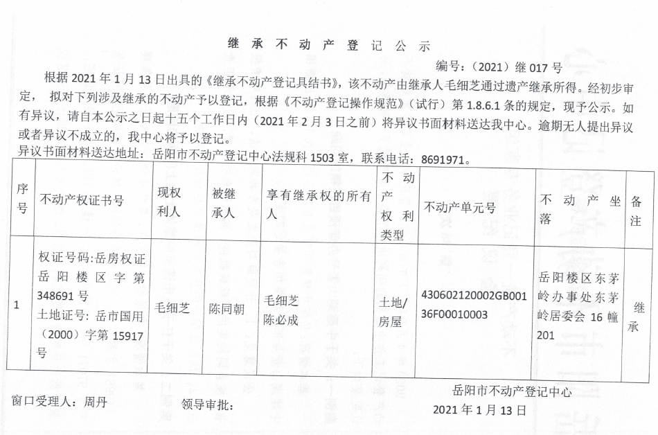 继承不动产登记公示 编号:(2021)继号017(毛细芝)