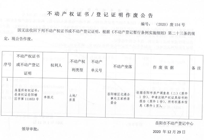 不动产权证书/登记证明作废公告(李胜元)