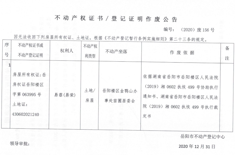 不动产权证书/登记证明作废公告(易荣)