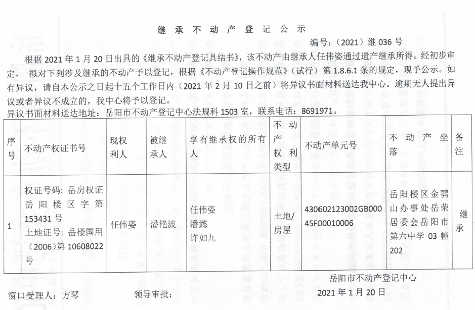 继承不动产登记公示 编号:(2021)继036号(任伟姿)