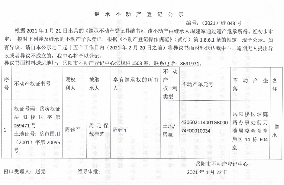 继承不动产登记公示 编号:(2021)继043号(周建军)