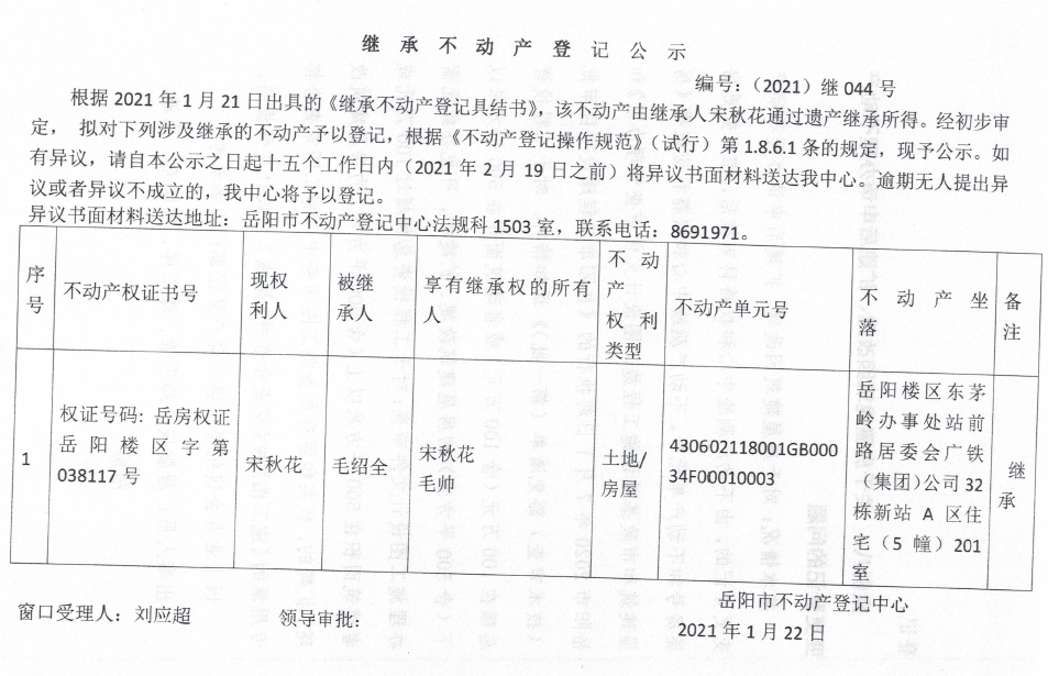 继承不动产登记公示 编号:(2021)继044号(宋秋花)