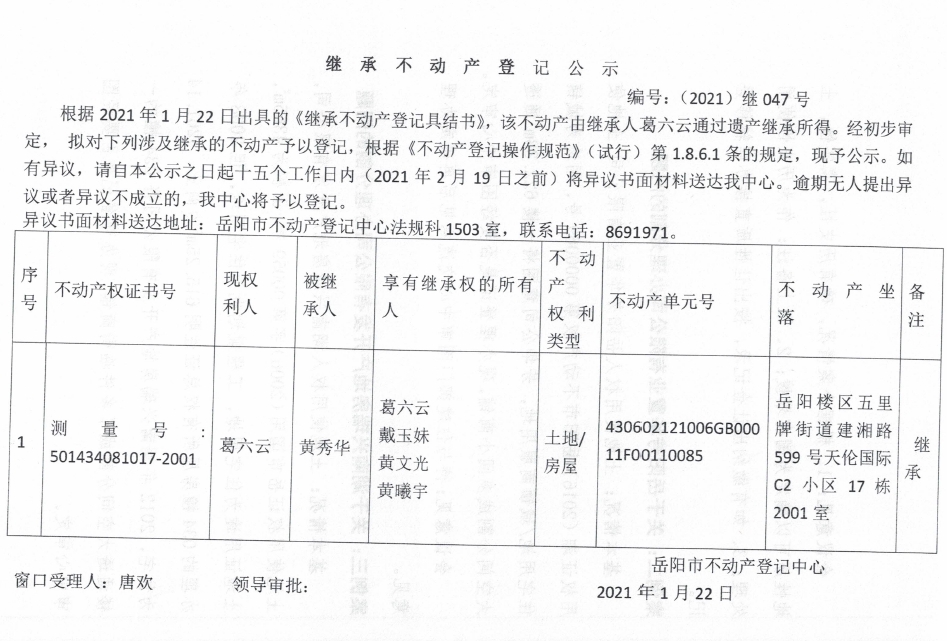 继承不动产登记公示 编号:(2021)继047号(葛六云)
