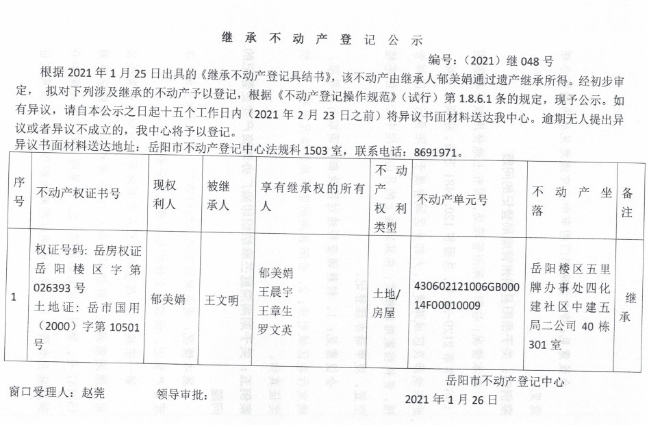继承不动产登记公示 编号:(2021)继048号(郁美娟)