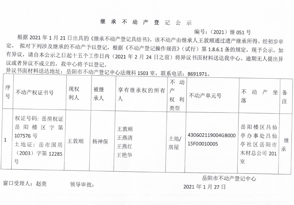 继承不动产登记公示 编号:(2021)继051号(王敦顺)