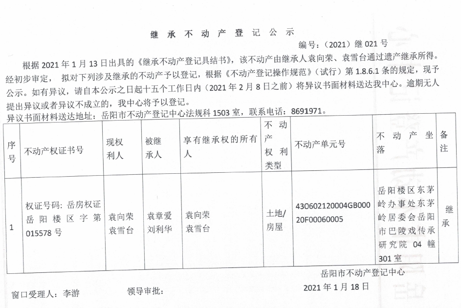 继承不动产登记公示 编号:(2021)继021号(袁雪台)