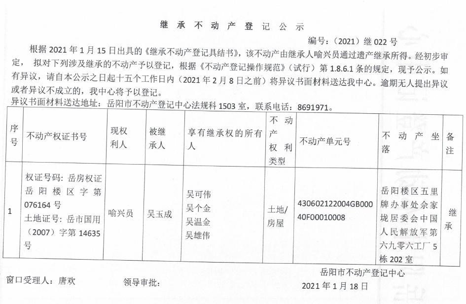 继承不动产登记公示 编号:(2021)继022号(喻兴员)