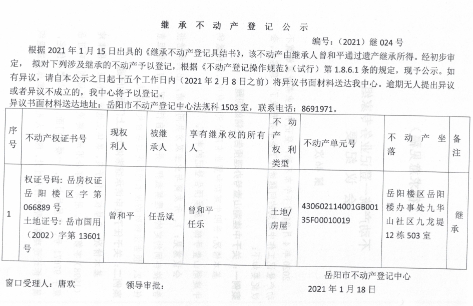 继承不动产登记公示 编号:(2021)继024号(曾和平)