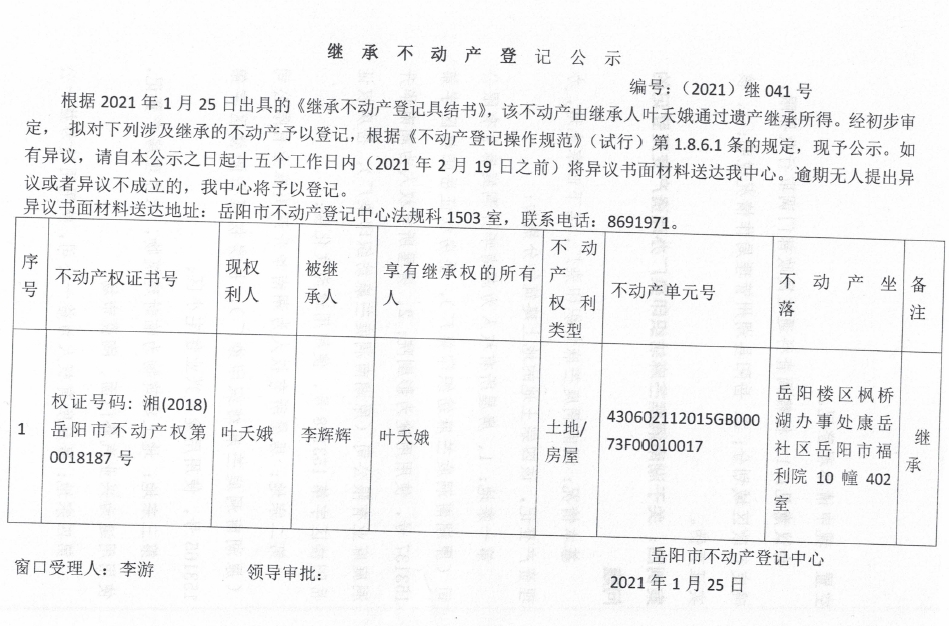 继承不动产登记公示 编号:(2021)继041号(叶夭娥)