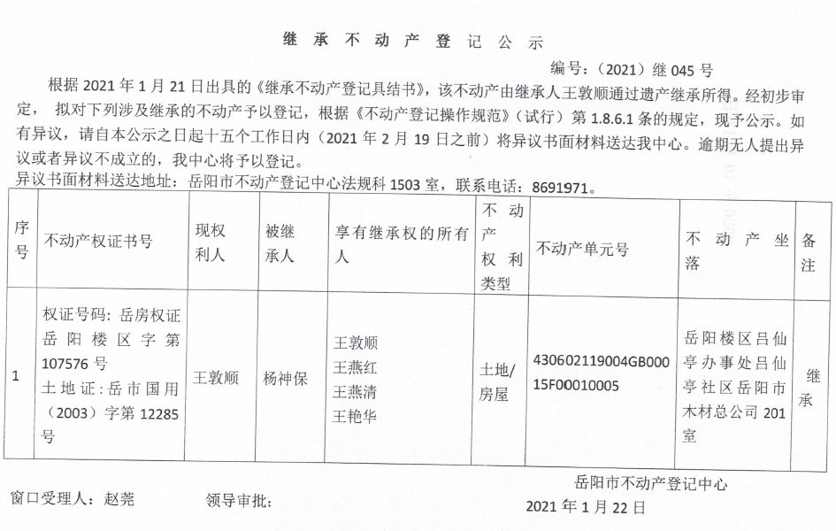 继承不动产登记公示 编号:(2021)继045号(王敦顺)