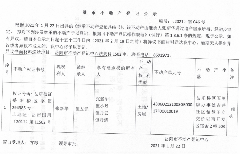 继承不动产登记公示 编号:(2021)继046号(张新华)
