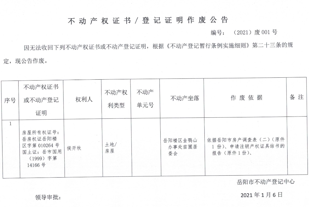 不动产权证书、登记证明作废公告 编号: (2021)废001号(侯开秋)