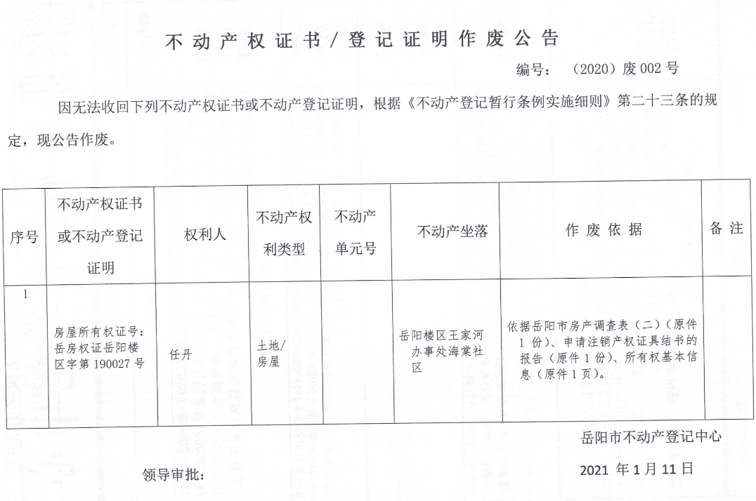 不动产权证书、登记证明作废公告 编号: (2021)废002号(任丹)