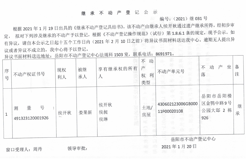 继承不动产登记公示 编号:(2021)继号031号(侯开秋)