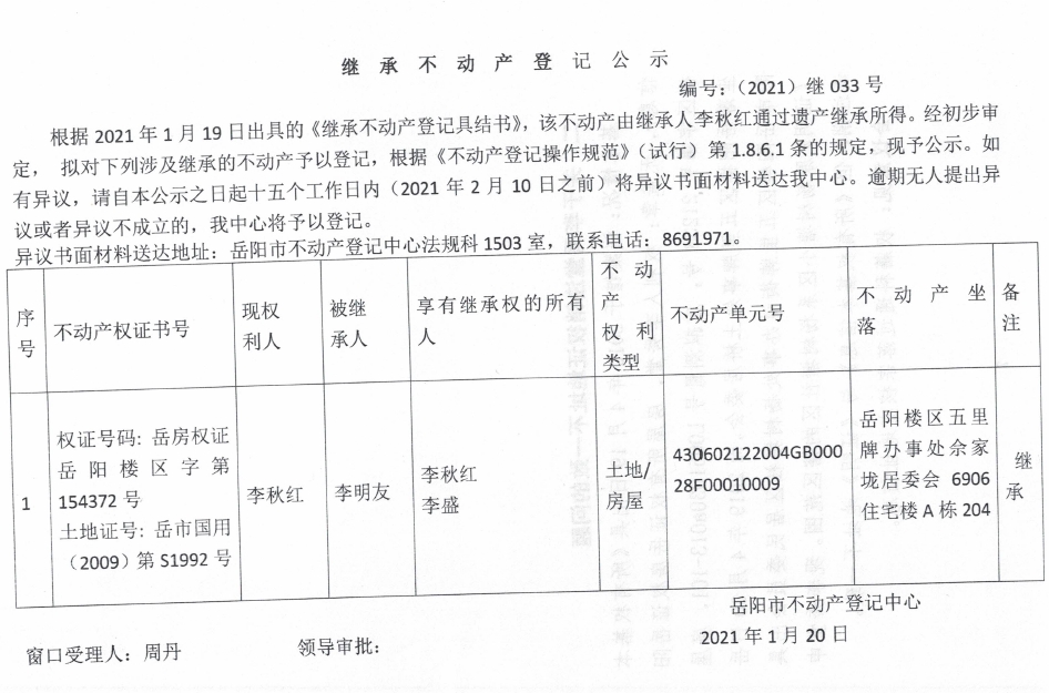 继承不动产登记公示 编号:(2021)继033号(李秋红)