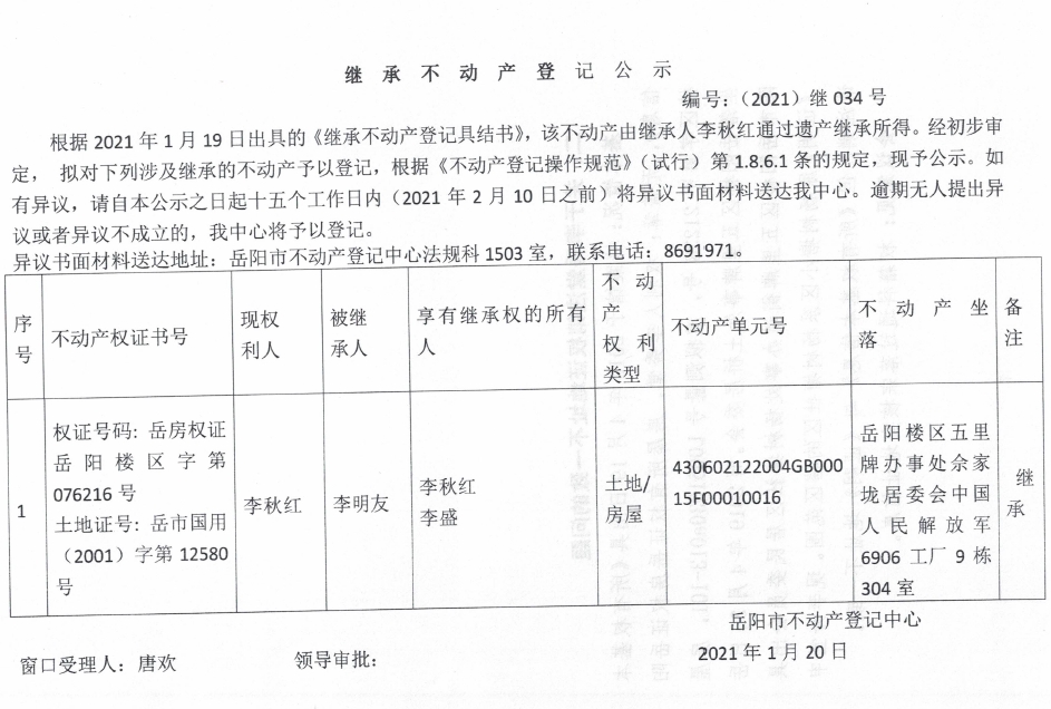继承不动产登记公示 编号:(2021)继034号(李秋红)