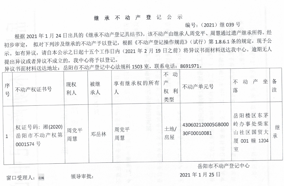 继承不动产登记公示 编号:(2021)继039号(周慧)