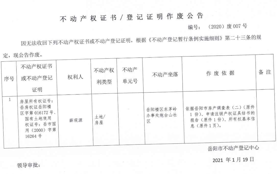 不动产权证书、登记证明作废公告 编号: (2021)废007号(薛观源)