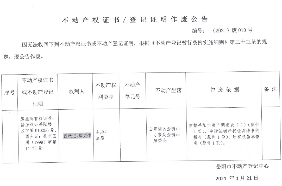 不动产权证书、登记证明作废公告 编号: (2021)废010号(曾跃进、周更生)