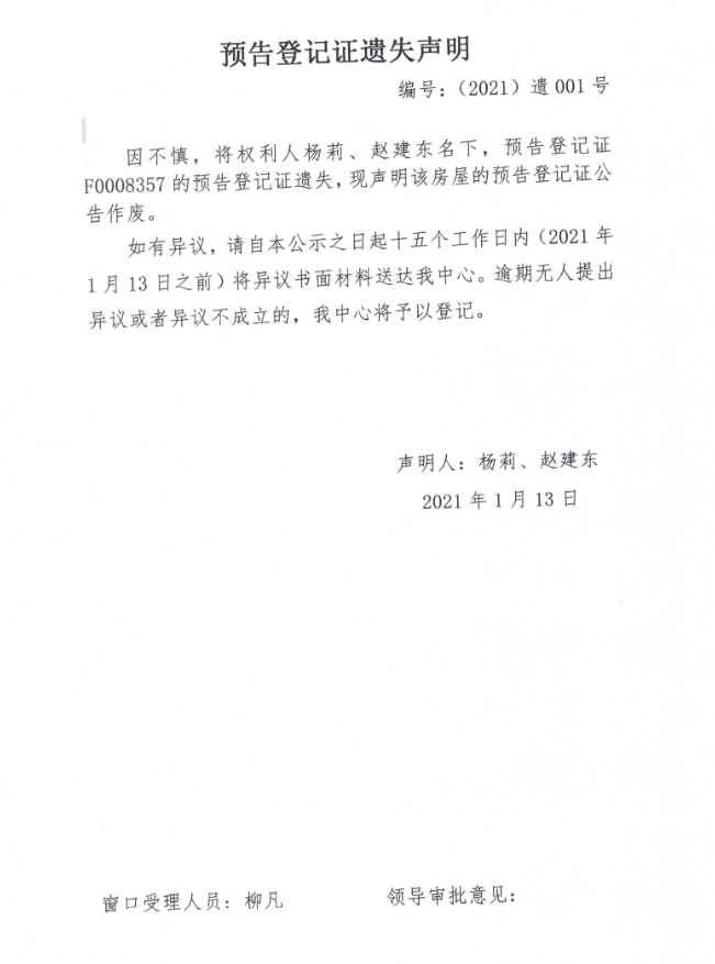 预告登记证遗失声明 编号:(2021)遗001号(杨莉、赵建东)